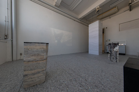 当制作では人工地層としての立体作品と映像、音声による空間づくりに取り組んでいる。この作品では人新世としての今現代において、人間の尺度を自然に認識することを促すものを配置、再掲することで人の営みのうちにある時間を考えるためのしつらえにする空間づくりを試みる。